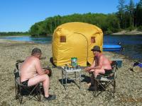 Ближе к конечной точке похода, а именно, как модно сейчас писать, в устьях рек Д. и П. (что примечательно, вода в П. была абсолютно чистая), начали встречаться люди. Ах, ну да, - сегодня же пятница! На рыбалку народ подтягивается. Было крайне приятно, когда экипаж проносящейся мимо под водомётом лодки, приветствуя, махал нам руками. Наверно сильно необычно мы выглядели на общем фоне представителей водно-моторного братства. Мы действительно сильно отвыкли за эти 14 дней от человеческого общества.