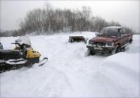 Через км три на дороге увидел замешкавшегося, нехилого кабана, зверь, увидев технику, выбирал, куда ему уйти -- влево или вправо. Пошёл налево. Через несколько км, лесовозка забирала круто вверх, полез в перевал. Несколько серпантинов не позволяет держать нужную скорость, с которой ХиЛюкс идет как крейсер. Были места, когда приходилось откатываться назад. Но всё же до пупка (вершина перевала) с прицепом не доехал метров 300-400. Пришлось отцеплять прицеп, угонять ХиЛюкс на перевал, а потом возвращаться. Скинул снежик с прицепа, и прицеп затянул снегоходом.