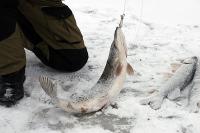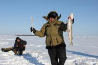 Садимся в километре от устья Бичи, место выбирали по количеству насверленных лунок и вытащенного из них льда, и, в принципе, угадали! Я сразу в течение получаса вытаскиваю две 4-х кг. За два часа у бати 15 штук, у меня 12 штук. Вся щука хорошая!