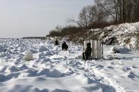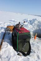 Поднялся до легендарного залива Счастья, батя сел на выходе залива, а я напротив по косе. За полдня по нулям, у бати правда таймень хороший взял, но сорвался, хорошо шнурок стоял, краб целым остался. Просверлив в общей сложности 30 лунок, поняли, что щуки здесь нет. Решили спуститься на Удыль, там вроде потихоньку ловиться. С озера народ куда-то исчез, остался только на мысе Каменистом. В дальнейшем выяснилось, что работает опергруппа с Комсомольска.