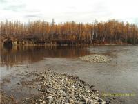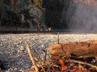 Уже во второй половине первого дня погода начала ухудшаться. Начали мочить приманки. Видимо для местных рыб наши самые ходовые нимфы оказались слишком мелкими. Поклевки были очень слабые. В основном на них брала молодь мальмы. Кстати предостережения Александра оказались не лишними. На каждой косе, где мы останавливались была масса свежих следов медведя. Места на реке конечно интереснейшие для рыбалки. Приятно удивил хариус взявший на Мепс 4 черную с красными точками. Именно эта блесна и оказалась самой ходовой. На первую ночь нас приютила зимуха которую пришлось еще поискать по реке, несмотря на наличие координат. Реальное расхождение с координатами составило около 200-250 метров. На второй день готовились к преодолению непроходного залома, однако при приближении к нему были приятно удивлены. Залом пропилен полностью, и проходится на ура. Спасибо тем, кто выполнил этот титанический труд. На мосту встретились с ребятами из Ванино. За небольшую помошь рыбаки одарили «хутинской мухой» - нимфой - морковкой раза в три больше нашей самой большой. Они-то и поведали, что зимовье Кости-ороча на впадении Сайдулюнэ, где мы планировали остановиться сожгли в прошлом году. Примечательно, что в ста метрах от пепелища была выстроена достаточно комфортабельная база. Местный сторож никого не пускает. К вечеру этого же дня мы встретились с мишкой, который задумчиво брел по другому берегу. Пугать животное не стали и прошли мимо. К слову на кету медведям в этом году расчитывать не пришлось. На нерест зашло катастрофическим мало рыбы. За все время мы видели только одну дохлую кетину. В ту ночь для нас начался мокрый период. Все последующие дни дождь лил стеной.