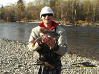Как то осенью выехали на Хор (среднее течение) на пару выходных дней. Выезд семейный, с детьми. Нас шесть человек и на берегу отдыхающих еще около двадцати. Автомобили, музыка, народ отдыхает. До деревни не далеко. В общем, очень доступное для всех место. Сразу приглянулись улова вдоль нашего берега, но количество стоявших в них рыбаков заставило все- таки надуть лодку и перейти на противоположную сторону реки для полноценного отдыха и рыбалки. Так и сделали. Собрал «Scierra» 11 класса, 15 футов длинны, поставил стример, прокидал все перспективные и не очень места. Не клюет. Лишь на имитацию крупной веснянки мне удалось подсечь на струе пару хороших ленков, но что- то тянуло на противоположный берег, именно в эти заводи со стоящими по краям рыбаками.