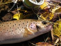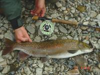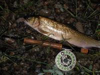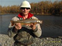 Поймав пару рыб, иду дальше, нужно дать ей успокоиться и на обратном пути опять попытать удачу. Иногда попадаешь в такую ситуацию, когда капризная рыба не хочет брать мушку. Подплывет, посмотрит, понюхает, отойдет, подумает и резко на дно. Со следующим твоим забросом все повторяется. Так несколько раз, потом хоть забросайся, ни за что не выйдет. Вот с такими осторожными ленками очень интересно иметь дело. Снимаешь сухую мушку, ставишь стримера. Но, как правило, поклевка будет единственная и осторожная. Если не поймался, ставишь опять сухую, но совсем другую, ярко- синюю с белыми крыльями, например. Такие варианты замены работали, но бывали случаи, когда приходилось оставлять «хитреца» в поисках другой, еще не напуганной рыбы.
