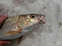 И тут случилось вот такая штука. Либо кто-то слишком сильно руками машет, либо у кого-то слишком большие и острые зубы. А ведь говорил, чтобы шнур поставил. Привыкли на горной харюзей дергать и на Амур с тонкой леской по той привычке и ходят, а потом сказки рассказывают про некого динозавра, который чуть в лунку не утащил, да руки по локоть не оторвал.
