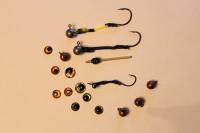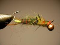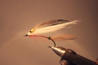 Можно изготовить стример на металлической трубке, подгрузив его в передней части свинцовой проволокой, которая в то же время служит шариком для разведения меха или пера в стороны (имитация головы подкаменщика). Хвост красного цвета из синтетических нитей (Ghost-Fiber) с небольшим добавлением люрекса (Angel Hair). Крыло сделано из меха (Bucktail). Голова- мех оленя, но немного, чтобы не увеличивать плавучесть. Плавники - перо курицы цвета «гризли» (Grizzly dyed Golden olive). Купить подходящие глазки в нашем городе невозможно. Один прилавок со скудным ассортиментом, несколько самых недорогих удочек пятого-седьмого класса, вот и все, что можно встретить в больших рыболовных магазинах. Попробовал изготавливать сам, но остановился на самых обыкновенных стразах, которые продаются в любом магазине «Ткани». Немного фантазии и перед вами глазки любой формы, размера и цвета. На трубку уместнее поставить перо джунглевого петуха, все-таки ближе к классике.