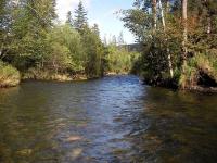 Плавно ступая по самому краю воды вверх по течению, простреливаю глазами перспективные места для заброса. Плес. Глубина посередине не более метра. Вода чистая и просматривается все, вплоть до противоположного берега, Рыбы не видно, лишь редкие всплески некрупного хариуса видны на спокойной глади воды. Не бросаю, иду дальше. Впереди, в метрах двадцати, небольшой перекат с последующим сужением в одну плотную струю, текущую вдоль противоположного берега. Глубина там, по предположению, около полуметра. Падающая тень от высоких деревьев, обрывистый бережок. Был бы рыбой, стоял бы именно там.